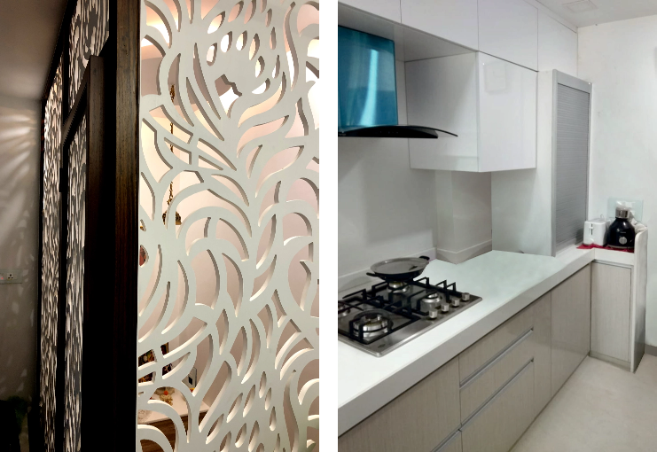 A beautiful residence with a splendid terrace located in the heart of the western suburbs. Large soundproof windows designed allow natural light to pour in throughout the day. Blend of neutral coloured walls with coloured and textured fabrics, rugs, pillows etc gave the required warmth to the space. Elegantly created temple space using intricate laser cut jaali in the living room highlighted the personality and values of the old aged couple.