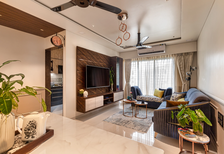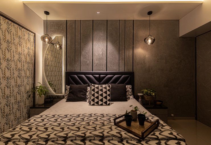 The space was carefully balanced using contemporary elements like moldings, fluted panels, decorative lights, trims etc. The subtle colour palette complimented the rustic textures of brick and stone used within the bedrooms. Moldings with dual colours on the walls of common spaces like living space, dining area, apartment aisle elevated the appearance giving it a sleek European touch.