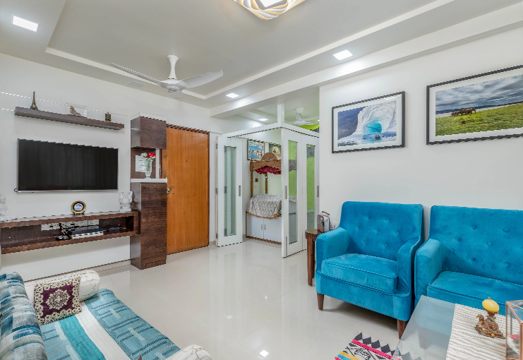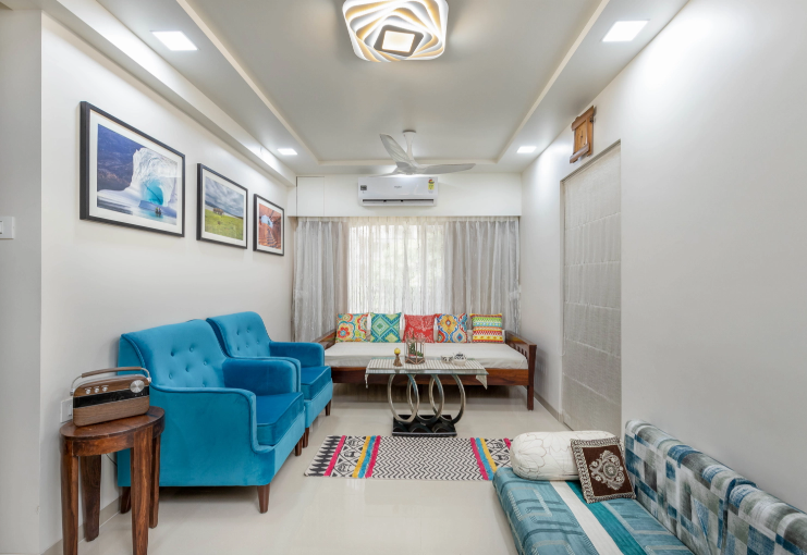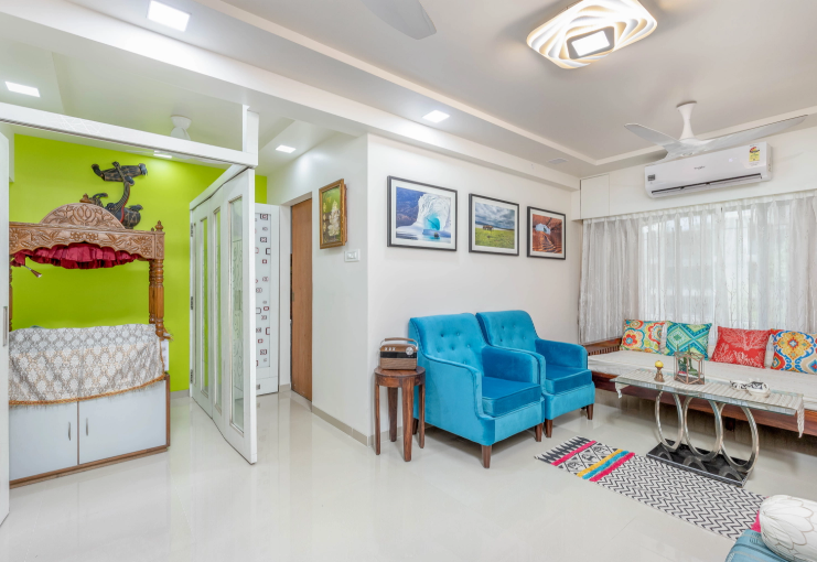 The space was remodelled to suit the contrasting personalities of a religious home maker and her engineer cum photographer son. The theme revolved around simple modern lines with lack of fussy details and use of bright colors which was the thread holding the family together.