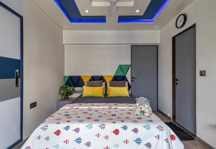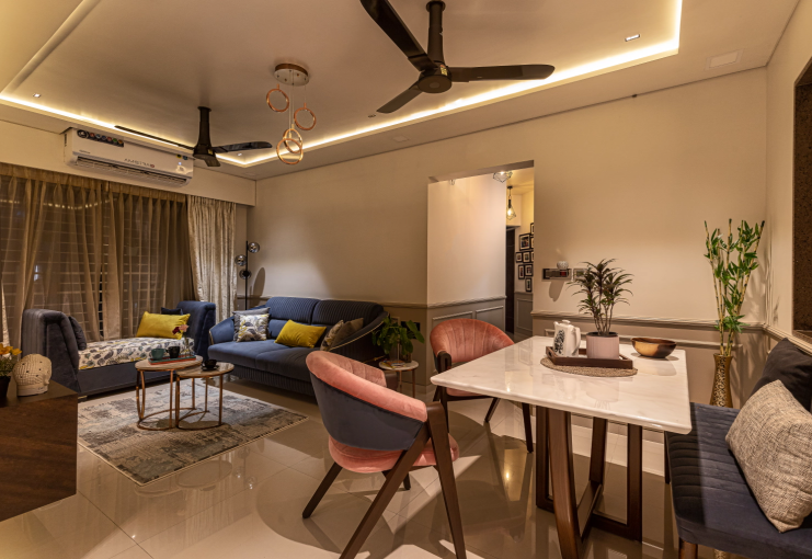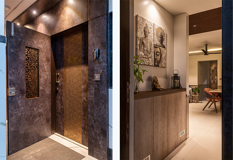 The space was carefully balanced using contemporary elements like moldings, fluted panels, decorative lights, trims etc. The subtle colour palette complimented the rustic textures of brick and stone used within the bedrooms. Moldings with dual colours on the walls of common spaces like living space, dining area, apartment aisle elevated the appearance giving it a sleek European touch.